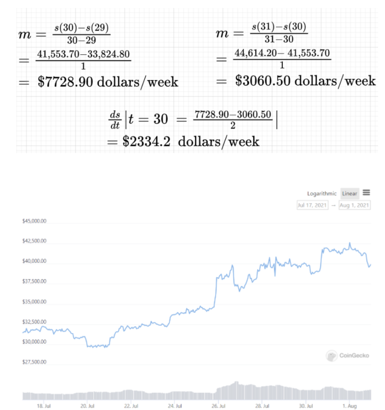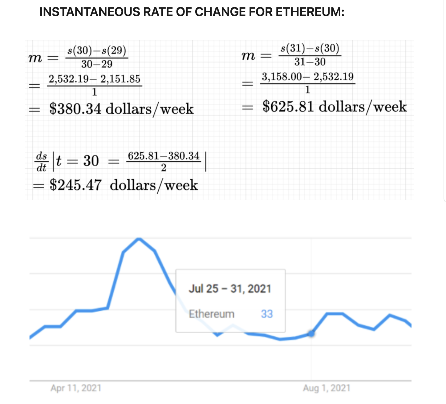 To calculate the instantaneous rate of day July 25, 2021, I used a method in which I average the intervals prior to and preceding July 25.The weeks from July 18th to August 1st had been a very "bullish" period for Ethereum climbing an average of $245.47 each week. Amazon confirmed it may be looking to digital currency for its platform, as it posted for a job listing for a digital currency expert for its payments team. Next up Jack Dorsey, Cathie Wood, and Elon Musk talked on the "The B-Word.". Where Elon said Tesla would be accepting bitcoin for vehicle purchases again. This news alongside the short squeeze and investors exiting their short positions advances the price even higher. Therefore moving the overall interest in Ethereum from 33 to 47.