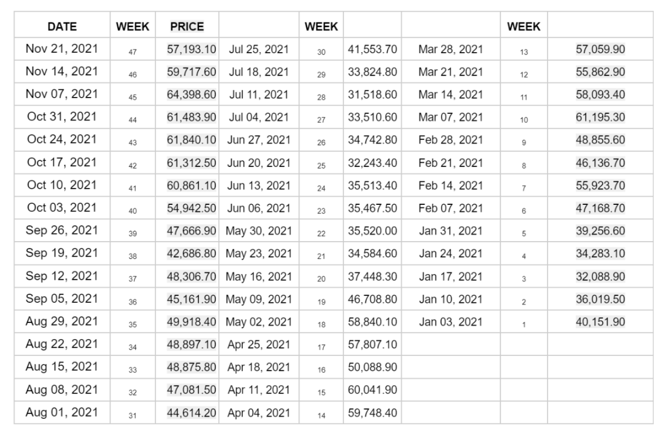 BITCOIN PRICE VALUES 2021: SHEETS