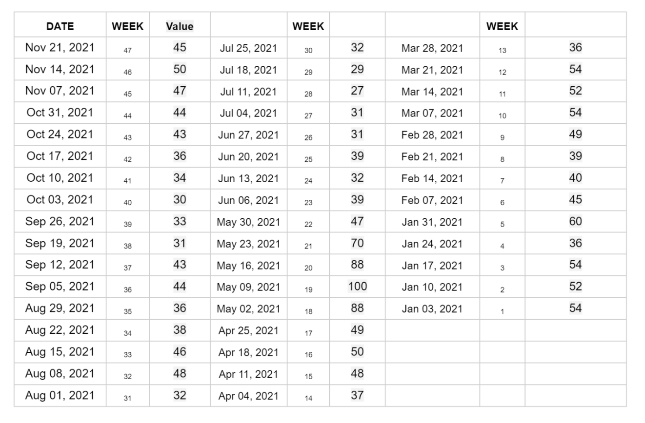 Numbers represent search interest relative to the highest point on the chart for the given region and time. A value of 100 is the peak popularity for the term. A value of 50 means that the term is half as popular.