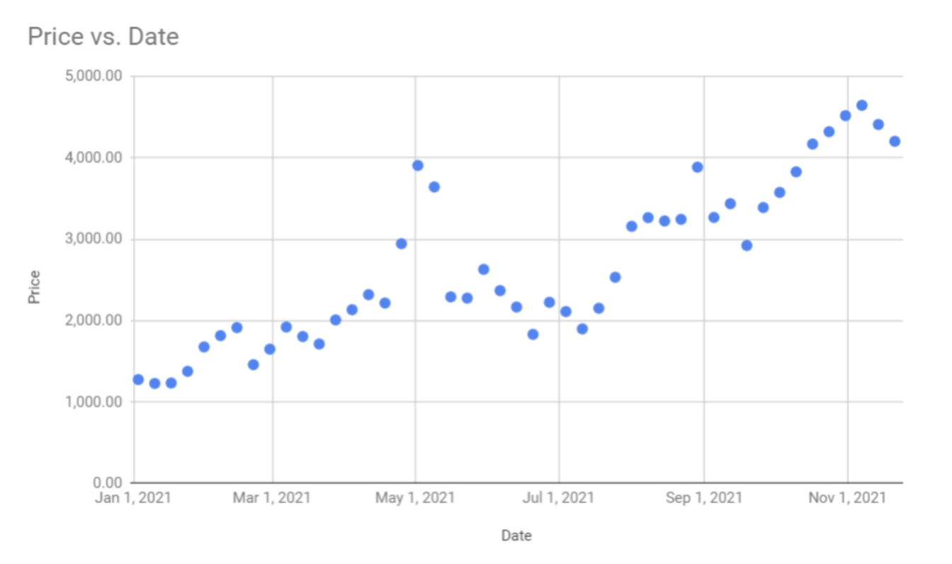 The "X" axis represents the ending Ethereum every week from Jan 3, 2021 – Nov 23, 2021. The "Y" represents the end price of one token of Ethereum corresponding to the week.