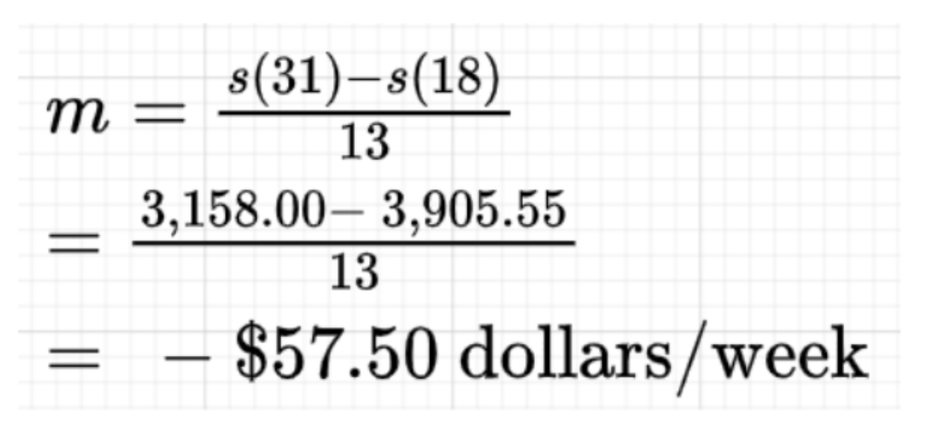 The calculations for the average describe the period of May 02, 2021, to Aug 01, 2021, where the price of Ethereum decreased on average by $57.50 per week. The secant line has a negative slope meaning the price decreased every week over the interval.